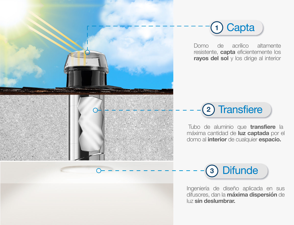 2. Transfiere. El tubo más reflectivo del mundo. Transfiere la máxima cantidad de luz solar hacia el interior de cualquier espacio.